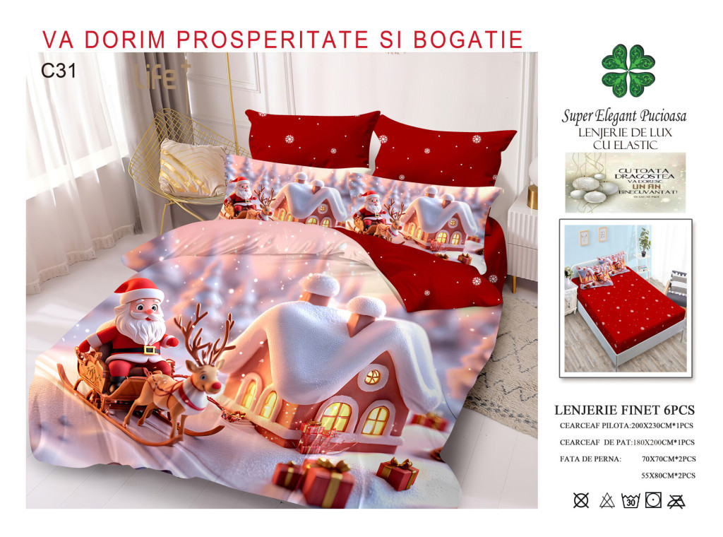Lenjerie de pat craciun finet cu elastic 6 piese - Cod C31